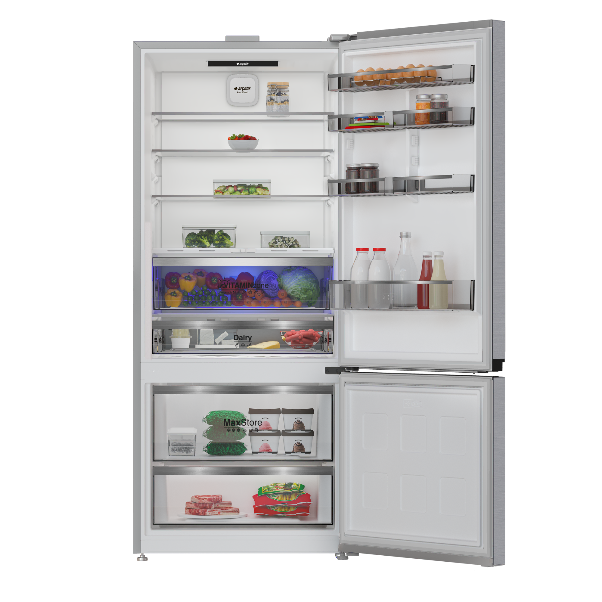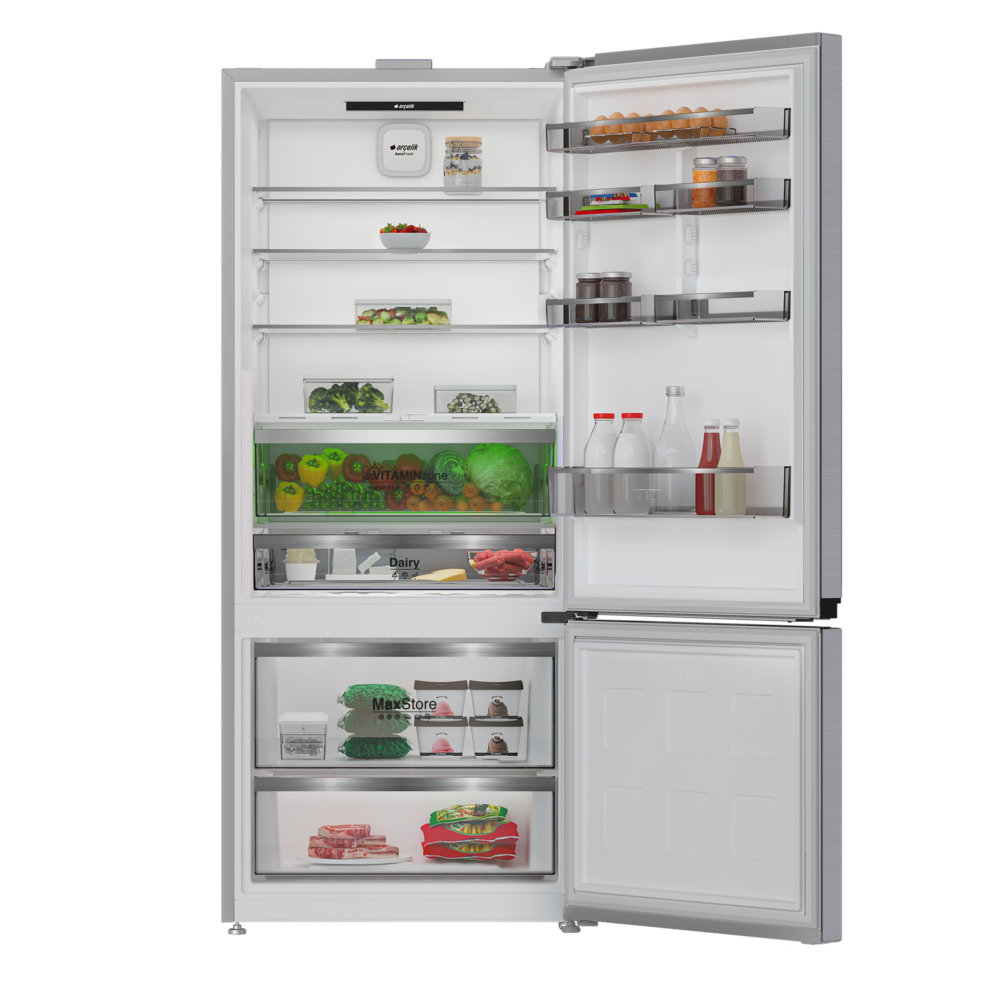 Her rafta homojen soğutma sağlayan AeroFresh Yeni Nesil İkili Soğutma Teknolojisi ile besinlerin tazeliği %30'a kadar daha uzun süre korunur. *Intertek tarafından gerçekleştirilen ağırlık kaybı ve “genel kabul edilebilirlik” parametresine göre raf ömrünün belirlendiği duyusal değerlendirme testleri; 12 gün boyunca AeroFresh buzdolabı ve kontrol buzdolabının (AeroFresh teknolojisi bulunmayan buzdolabı) alt ön raflarında saklanan havuç, taze kesim göbek marul, taze kesim domates, çilek, salam ve kaşar peyniri ile gerçekleştirilmiştir.